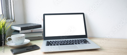 © yozachika, Fototapeta premium Laptop computer with white blank screen on wood desk. Workspace, workplace, desktop office concept.