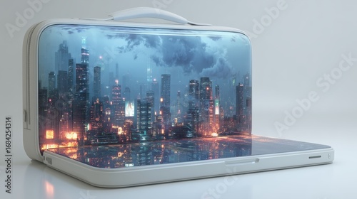 © IMOTIONart, Fototapeta premium Laptop displaying cityscape reflection
