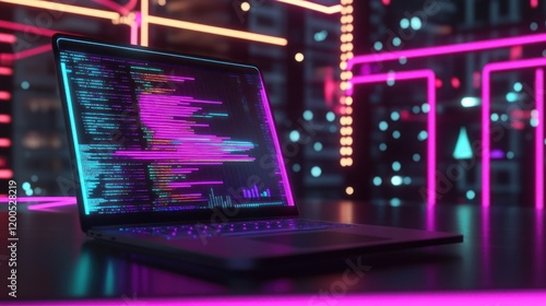 © hazia, Obraz premium Laptop displaying colorful code in futuristic setting.