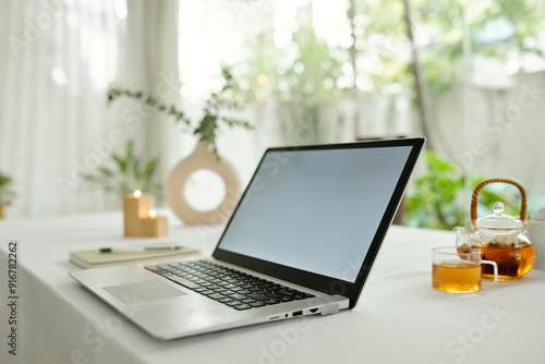 © DragonImages, Fototapeta premium Laptop for freelance work on table in the room