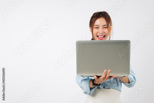 © sorapop, Fototapeta premium Laptop glowing as happy woman smiling positive focuses and types, with a second laptop behind her as part of her working routine on computer portable. isolated studio white background