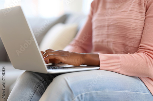 © ChanelBot/Peopleimages - AI, Fototapeta premium Laptop, hand and person typing an email or message for social media marketing, business or networking. Closeup, computer and video call with friends or colleagues for content creation and research
