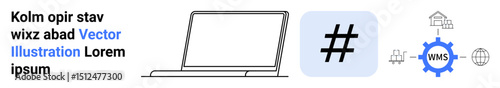 Fototapeta premium Laptop image, metadata tag symbol, and WMS gear connecting global shipping, logistics, and management. Ideal for technology, supply chain, productivity, communication automation networking simple