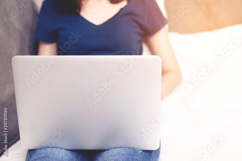 © methaphum, Naklejka premium laptop. lifestyle woman close up hand keyboard sit on the bedroom a using a notebook computer to work from home and search information social network online. wfh.