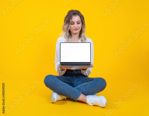 Naklejka premium Laptop mock up, young caucasian full body length woman sit floor with laptop mock up. Holding using modern computer notebook with empty blank white screen. Young IT lady, businesswoman offer web page