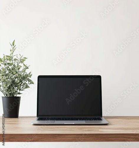 © Fathor, Fototapeta premium Laptop mockup on a wooden table with a plant, against a white background, in a minimalist style, studio photography, stock photo.