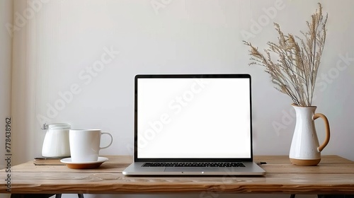 © Barbara Taylor, Obraz premium laptop mockup with blank white screen, on desk, plants, coffee cup