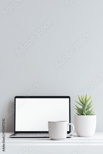 Obraz premium Laptop, mug, and succulent plant on white table. Minimalist workspace with empty screen