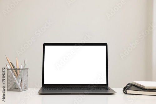 © New Africa, Fototapeta premium Laptop, notebook and stationery on white desk indoors. Mockup for design