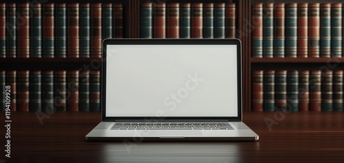 Fototapeta premium Laptop on a desk in front of a bookshelf filled with legal books.