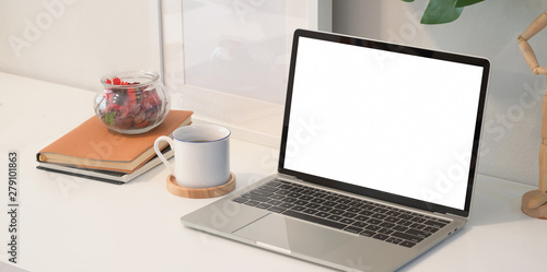 Fototapeta premium Laptop on white wooden desk in creative studio