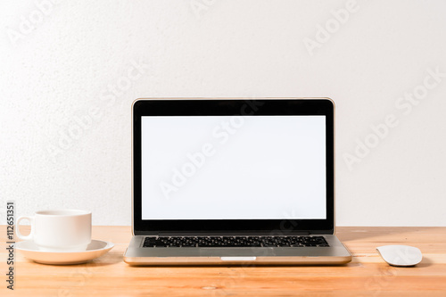 © praphab144, Fototapeta premium Laptop stands on a wooden table
