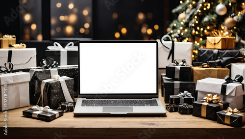 © Ольга Симонова, Fototapeta premium Laptop with a white screen mock up on table in the office of Christmas decor with gift boxes to employees, shopping, corporate gifts, Black Friday,.