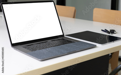 © Wasan, Fototapeta premium Laptop with blank screen on office desk.