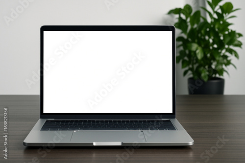 © You, Fototapeta premium Laptop with blank white screen for mockup on a wooden desk in a cozy, sunlit home office setting.