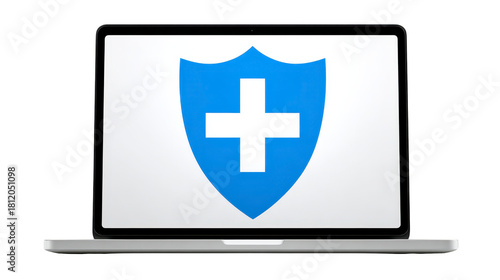 Fototapeta premium Laptop with blue shield and white cross symbol on screen, representing...