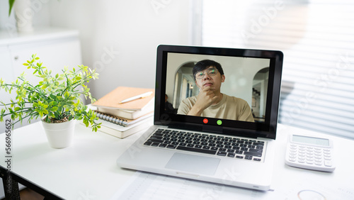 © Charlie's, Fototapeta premium Laptop with Mock up blank screen on wooden table in front of cafe space for text. product display computer laptop montage- technology Freelance work concept