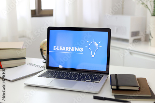 Fototapeta premium Laptop with Mock up blank screen on wooden table in front of coffeeshop cafe space for text. product display montage- technology concept.