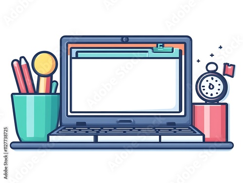 Fototapeta premium Laptop Workspace With Pencils Timer And Holder