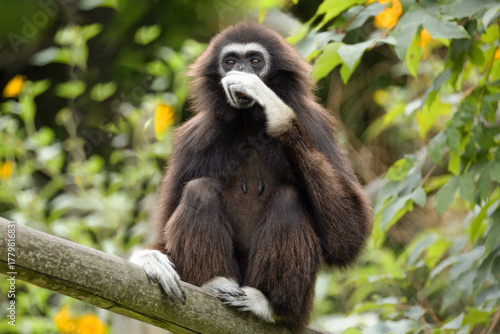 Naklejka premium lar gibbon white-handed gibbon, an endangered primate in the gibbon family