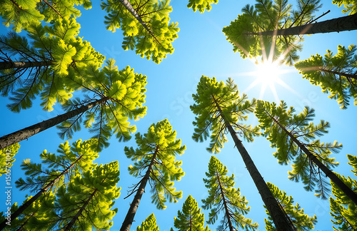 © fotoluigi868, Obraz premium larch branches stretch upwards clear blue sky bright sunny spring morning forest