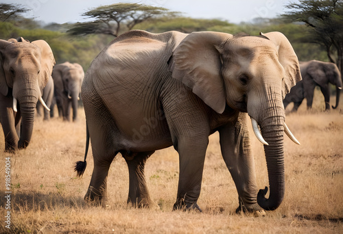 © Hafiza Khatun Shapla, Fototapeta premium Large african elephant bull walking on savanna with herd