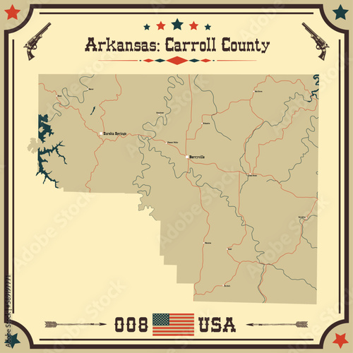 Fototapeta premium Large and accurate map of Carroll County, Arkansas, USA with vintage colors.