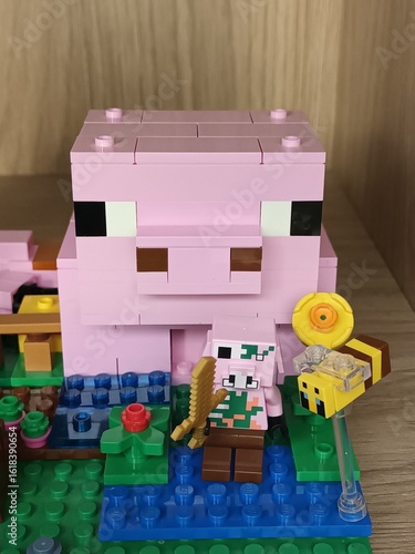 Naklejka premium Large and Small Lego Minecraft Pigs with Accessories