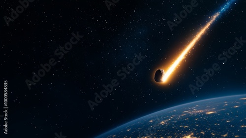 © Diffin, Obraz premium Large asteroid is approaching earth against background of endless space. Blazing asteroid hurtling towards Earth with glowing fire trail, cosmic view illuminated cities visible on planet's surface