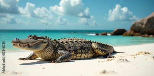 Naklejka premium Large Australian saltwater crocodile lying on white sand beach, reptile,...