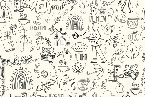 Obraz premium Large autumn doodle outline seamless pattern. Coloring background with various fall elements