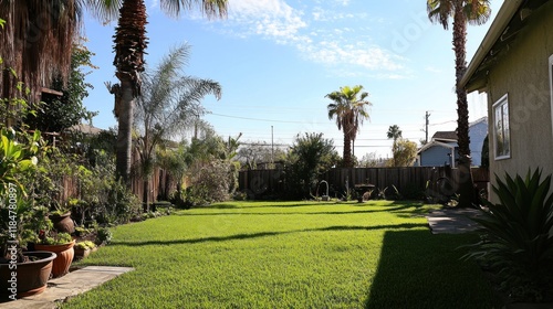 Fototapeta premium Large backyard garden of a suburban house with lush green trees on terrace...