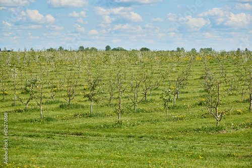 Fototapeta premium Large beautiful green apple orchard in summer