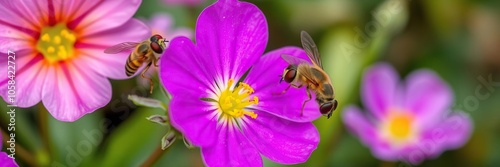 © Pawina, Fototapeta premium Large bee fly bombyliu major collecting nectar from a vibrant primrose flower, pollination, primrose