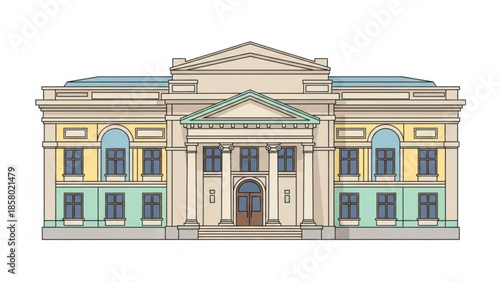 © Mehran, Fototapeta premium Large beige building with green and yellow accents and many windows
