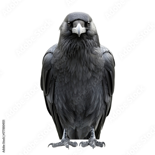 © Photolife , Obraz premium Large black raven in strict front view on a white transparent background. The bird sits with spread wings and a stern look, creating an impression of wisdom and mystery