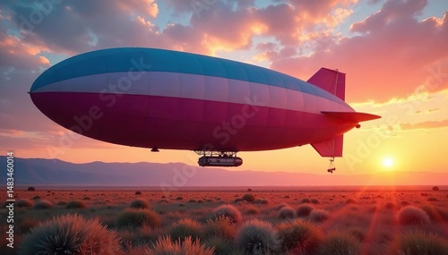 Fototapeta premium Large blimp, colorful fabric, sunrise backdrop, sky, view, above