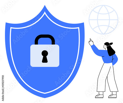 Fototapeta premium Large blue shield and padlock represent cybersecurity and privacy. Woman pointing at globe indicates global connection. Ideal for online safety, data protection, cybersecurity, encryption, digital
