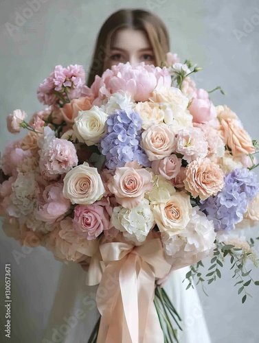 © ai_katrin, Naklejka premium large bouquet of pastel roses, peonies, and hydrangeas, wrapped in luxurious silk ribbons, held by a woman