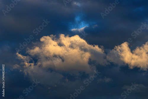 Fototapeta premium Large bright fluffy clouds against a dark mood-filled layered dramatic sky.