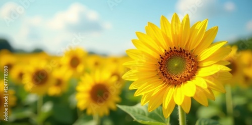 © Buakung, Fototapeta premium Large bright yellow sunflower petals unfolding in the breeze , garden, bloom, flowers