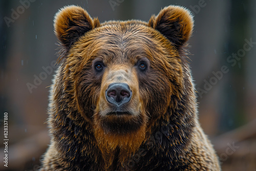 Obraz premium Large brown bear standing alert in a sunny forest clearing