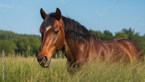 © The 2R Artificiality, Fototapeta premium Large brown horse grazing on grass, showcasing a peaceful moment in nature