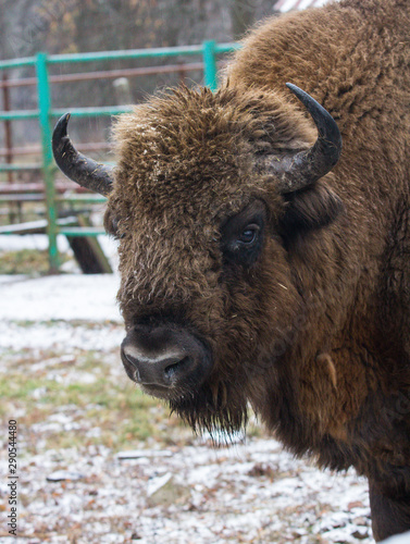 © Natalia, Obraz premium Large brown wisent or european brown bison with big horn and brown eyes in the winter forest.