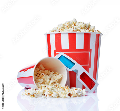 © viktoriya89, Naklejka premium Large bucket and small cup of appetizing salty popcorn with 3d anaglyph glasses