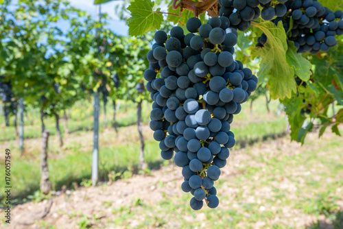 Obraz premium Large bunche of red wine grapes in summer vineyard.