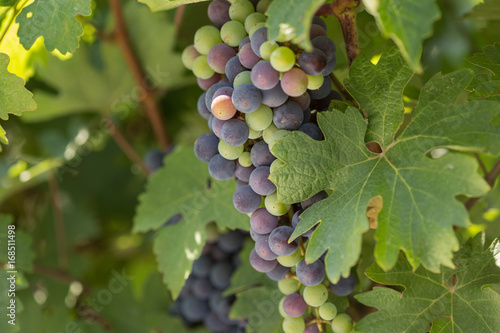 © aneduard, Fototapeta premium Large bunches of black grapes ripen against a background of greenery