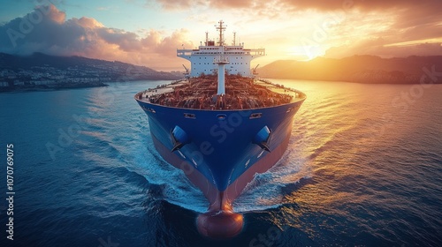 © ALIF JATI KUSUMA, Fototapeta premium Large cargo ship sailing on the ocean at sunset.