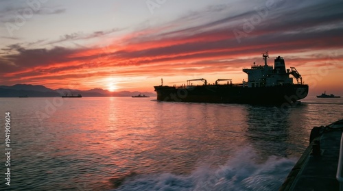 © Andi, Fototapeta premium Large cargo ship silhouetted against a vibrant orange and red sunset over a calm ocean horizon