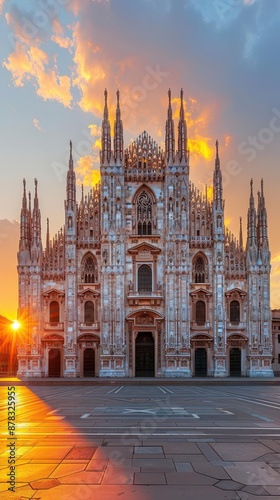 © POLO VECTORS, Fototapeta premium large cathedral with a clock tower in front of a sunset